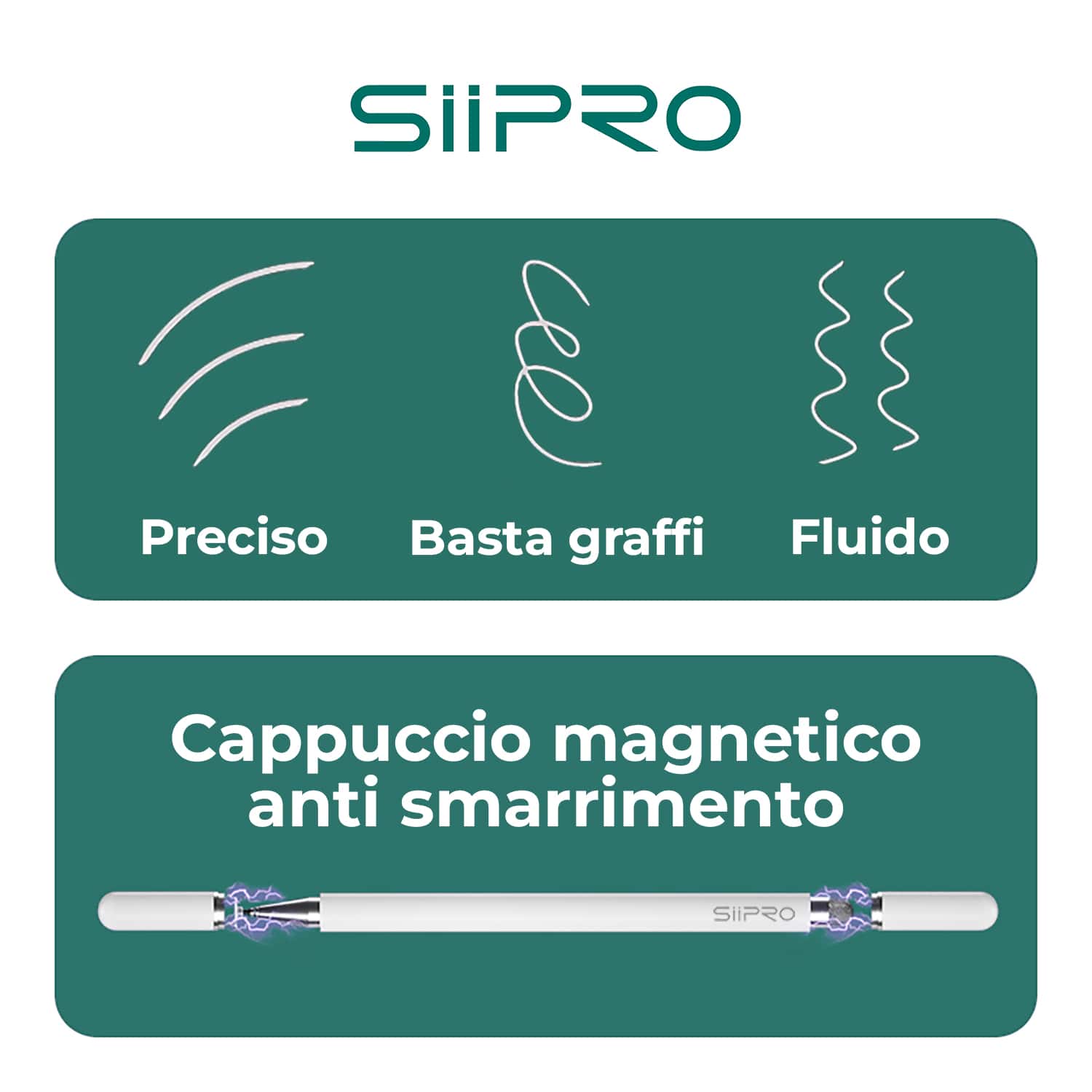 La penna Siipro 2 in 1 è pronta all’uso e non ha bisogno di essere ricaricata o di bluetooth. Le due testine si possono adattare a tutti i modelli di Apple iPhone e iPad, Samsung, Xiaomi, LG, Huawei, Oppo e Microsoft. Grazie al disco in plastica (da non rimuovere e tagliare) il vostro dispositivo non verrà più graffiato. Nella confezione è disponibile una testina di ricambio che si trova sotto la testina tonda. Il pennino ha il corpo in metallo e il cappuccio magnetico anti smarrimento. Non avrete più impronte sullo schermo! Il suo tocco è preciso e fluido. Apprezzerete la sua reattività e la sua comodità. Non importa che sia lavoro, svago o gioco, la penna si adatta a ogni situazione. Potrete disegnare, sottolineare, colorare e scrivere senza pensieri